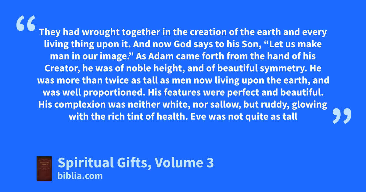 They had wrought together in the creation of the earth and every living thing upon it. And now God says to his Son, “Let us make man in our image.” As Adam came forth from the hand of his Creator, he was of noble height, and of beautiful symmetry. He was more than twice as tall as men now living upon the earth, and was well proportioned. His features were perfect and beautiful. His complexion was neither white, nor sallow, but ruddy, glowing with the rich tint of health. Eve was not quite as tall