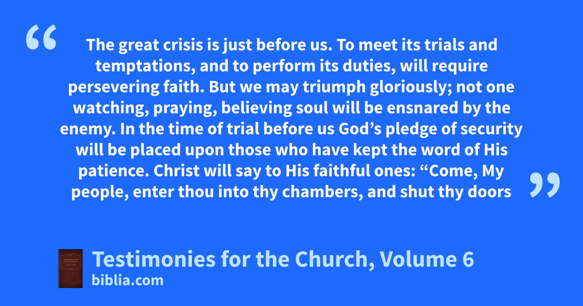 The great crisis is just before us. To meet its trials and temptations, and to perform its duties, will require persevering faith. But we may triumph gloriously; not one watching, praying, believing soul will be ensnared by the enemy. In the time of trial before us God’s pledge of security will be placed upon those who have kept the word of His patience. Christ will say to His faithful ones: “Come, My people, enter thou into thy chambers, and shut thy doors
