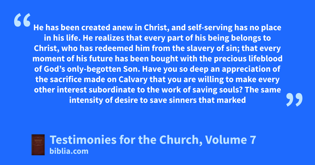 He has been created anew in Christ, and self-serving has no place in his life. He realizes that every part of his being belongs to Christ, who has redeemed him from the slavery of sin; that every moment of his future has been bought with the precious lifeblood of God’s only-begotten Son. Have you so deep an appreciation of the sacrifice made on Calvary that you are willing to make every other interest subordinate to the work of saving souls? The same intensity of desire to save sinners that marked