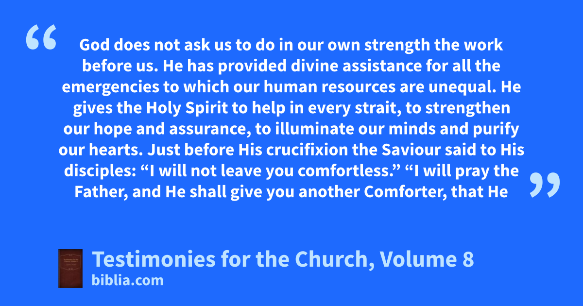 God does not ask us to do in our own strength the work before us. He has provided divine assistance for all the emergencies to which our human resources are unequal. He gives the Holy Spirit to help in every strait, to strengthen our hope and assurance, to illuminate our minds and purify our hearts. Just before His crucifixion the Saviour said to His disciples: “I will not leave you comfortless.” “I will pray the Father, and He shall give you another Comforter, that He