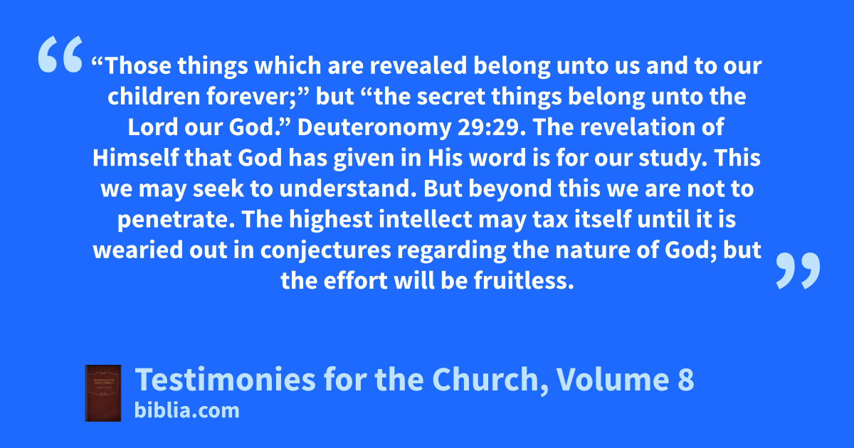“Those things which are revealed belong unto us and to our children forever;” but “the secret things belong unto the Lord our God.” Deuteronomy 29:29. The revelation of Himself that God has given in His word is for our study. This we may seek to understand. But beyond this we are not to penetrate. The highest intellect may tax itself until it is wearied out in conjectures regarding the nature of God; but the effort will be fruitless.