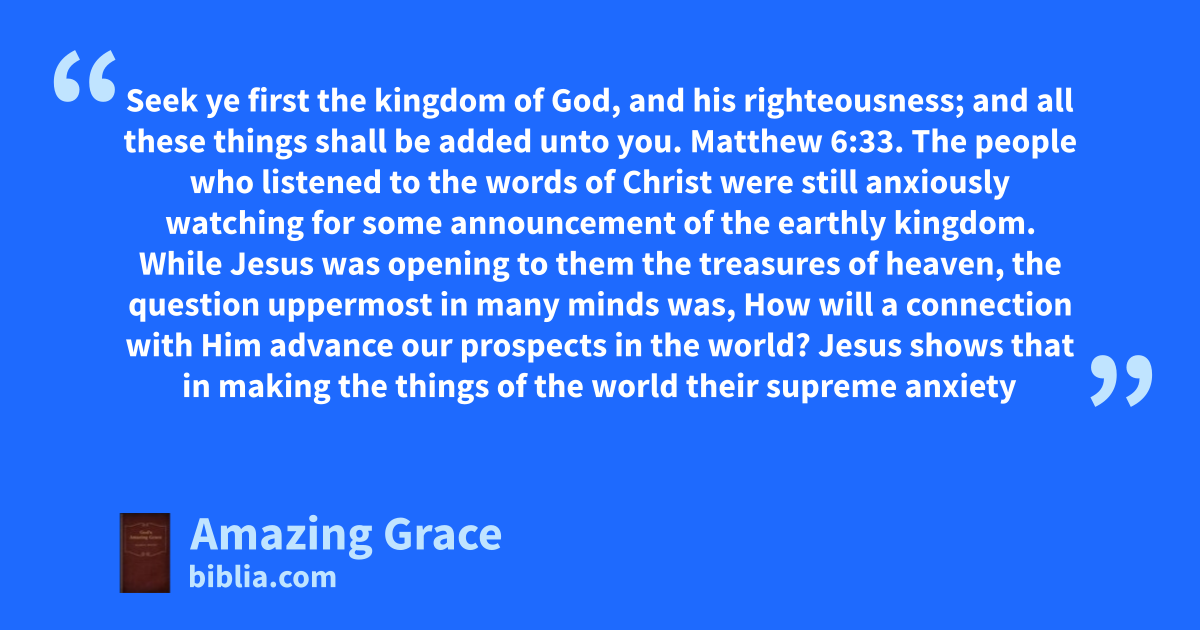 Seek ye first the kingdom of God, and his righteousness; and all these things shall be added unto you. Matthew 6:33. The people who listened to the words of Christ were still anxiously watching for some announcement of the earthly kingdom. While Jesus was opening to them the treasures of heaven, the question uppermost in many minds was, How will a connection with Him advance our prospects in the world? Jesus shows that in making the things of the world their supreme anxiety