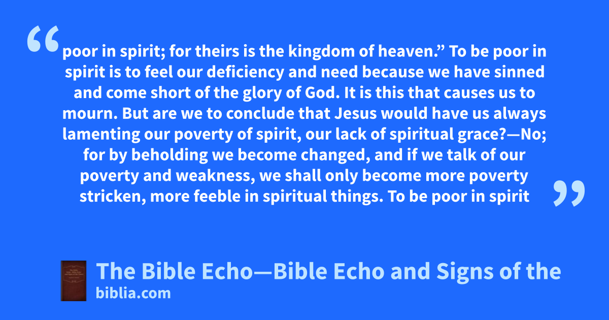 poor in spirit; for theirs is the kingdom of heaven.” To be poor in spirit is to feel our deficiency and need because we have sinned and come short of the glory of God. It is this that causes us to mourn. But are we to conclude that Jesus would have us always lamenting our poverty of spirit, our lack of spiritual grace?—No; for by beholding we become changed, and if we talk of our poverty and weakness, we shall only become more poverty stricken, more feeble in spiritual things. To be poor in spirit