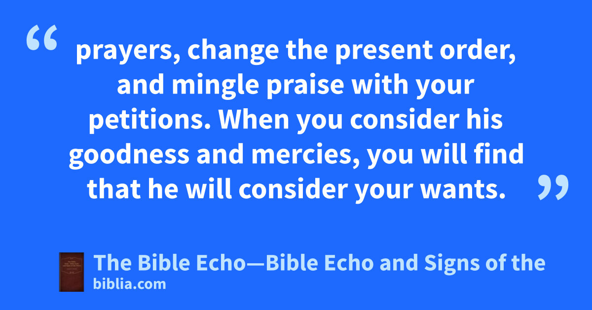 prayers, change the present order, and mingle praise with your petitions. When you consider his goodness and mercies, you will find that he will consider your wants.