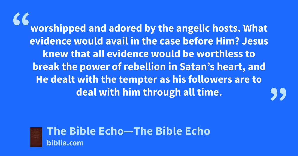 worshipped and adored by the angelic hosts. What evidence would avail in the case before Him? Jesus knew that all evidence would be worthless to break the power of rebellion in Satan’s heart, and He dealt with the tempter as his followers are to deal with him through all time.