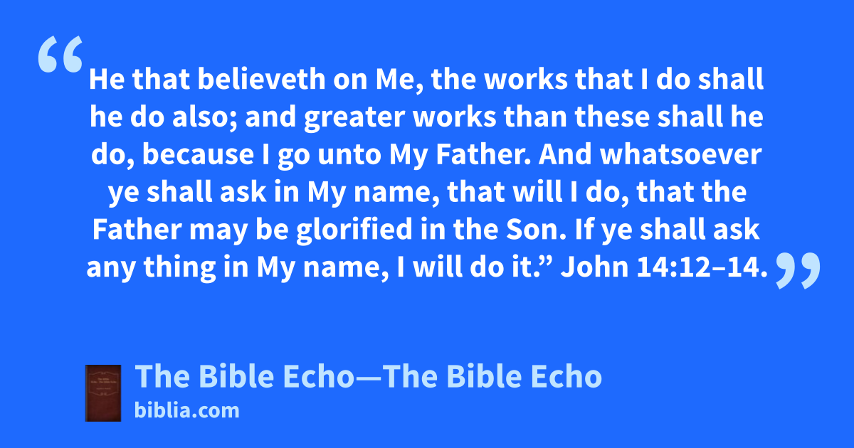 He that believeth on Me, the works that I do shall he do also; and greater works than these shall he do, because I go unto My Father. And whatsoever ye shall ask in My name, that will I do, that the Father may be glorified in the Son. If ye shall ask any thing in My name, I will do it.” John 14:12–14.