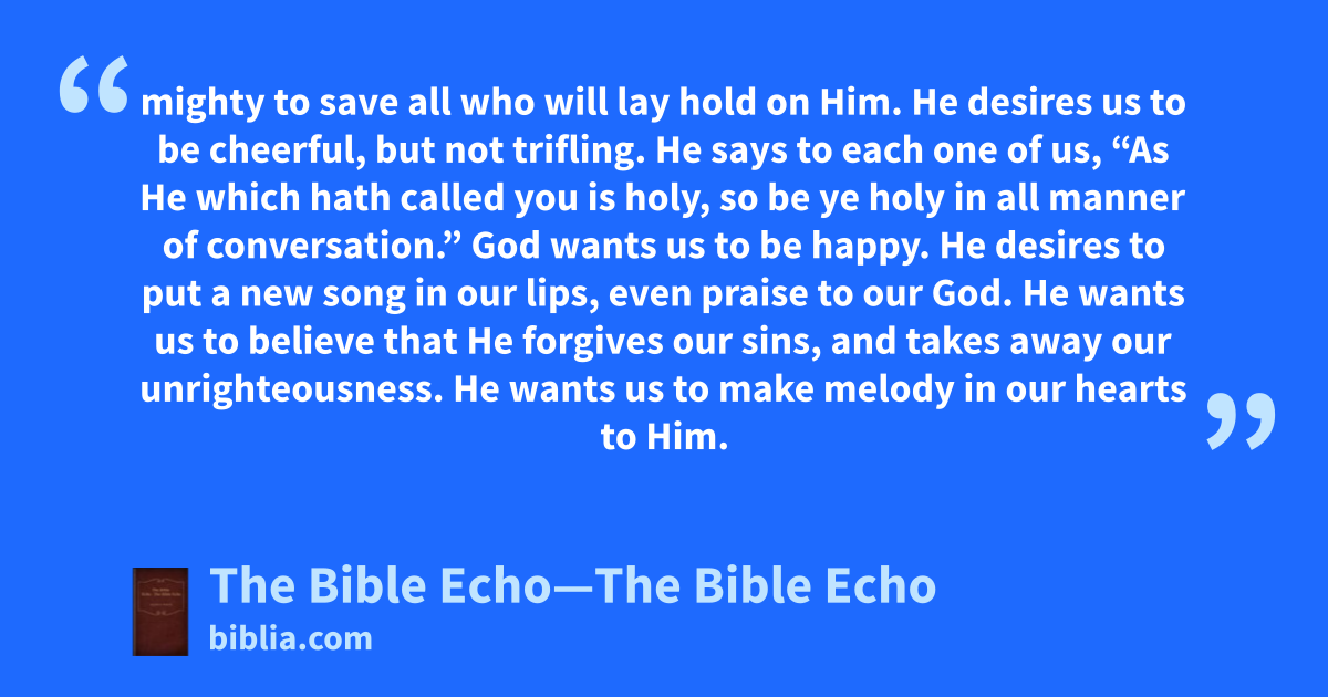 mighty to save all who will lay hold on Him. He desires us to be cheerful, but not trifling. He says to each one of us, “As He which hath called you is holy, so be ye holy in all manner of conversation.” God wants us to be happy. He desires to put a new song in our lips, even praise to our God. He wants us to believe that He forgives our sins, and takes away our unrighteousness. He wants us to make melody in our hearts to Him.