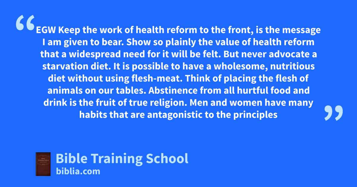 EGW Keep the work of health reform to the front, is the message I am given to bear. Show so plainly the value of health reform that a widespread need for it will be felt. But never advocate a starvation diet. It is possible to have a wholesome, nutritious diet without using flesh-meat. Think of placing the flesh of animals on our tables. Abstinence from all hurtful food and drink is the fruit of true religion. Men and women have many habits that are antagonistic to the principles