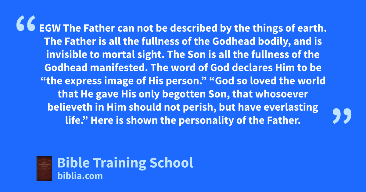 EGW The Father can not be described by the things of earth. The Father is all the fullness of the Godhead bodily, and is invisible to mortal sight. The Son is all the fullness of the Godhead manifested. The word of God declares Him to be “the express image of His person.” “God so loved the world that He gave His only begotten Son, that whosoever believeth in Him should not perish, but have everlasting life.” Here is shown the personality of the Father.
