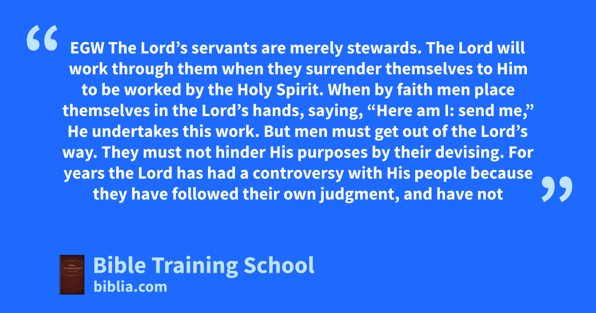 EGW The Lord’s servants are merely stewards. The Lord will work through them when they surrender themselves to Him to be worked by the Holy Spirit. When by faith men place themselves in the Lord’s hands, saying, “Here am I: send me,” He undertakes this work. But men must get out of the Lord’s way. They must not hinder His purposes by their devising. For years the Lord has had a controversy with His people because they have followed their own judgment, and have not