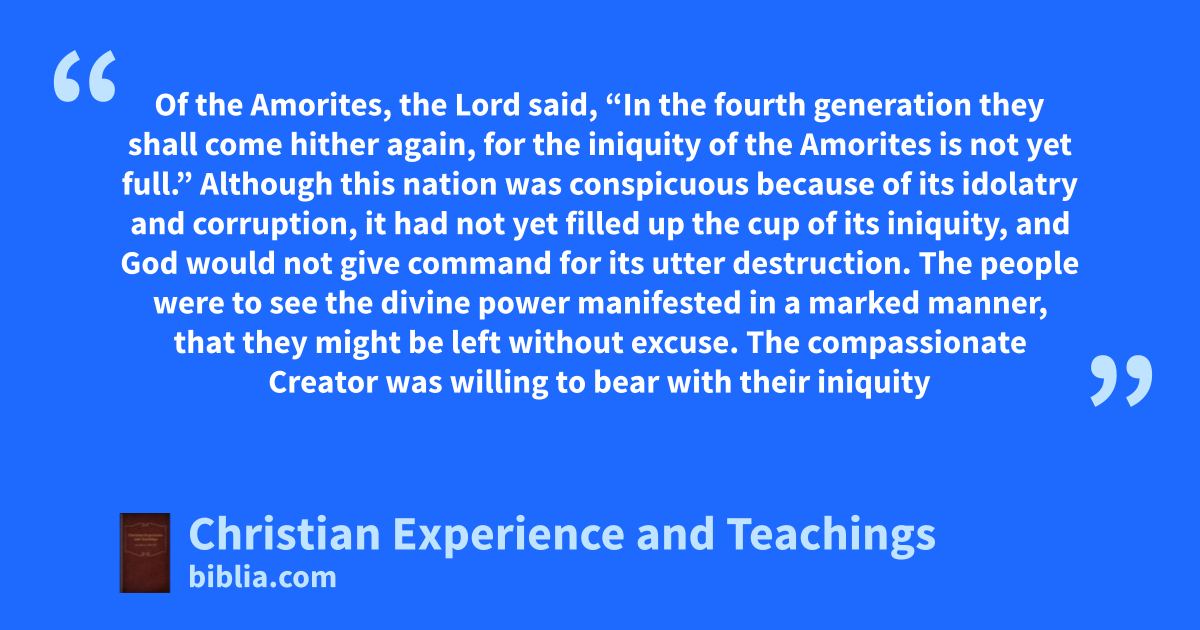 Of the Amorites, the Lord said, “In the fourth generation they shall come hither again, for the iniquity of the Amorites is not yet full.” Although this nation was conspicuous because of its idolatry and corruption, it had not yet filled up the cup of its iniquity, and God would not give command for its utter destruction. The people were to see the divine power manifested in a marked manner, that they might be left without excuse. The compassionate Creator was willing to bear with their iniquity