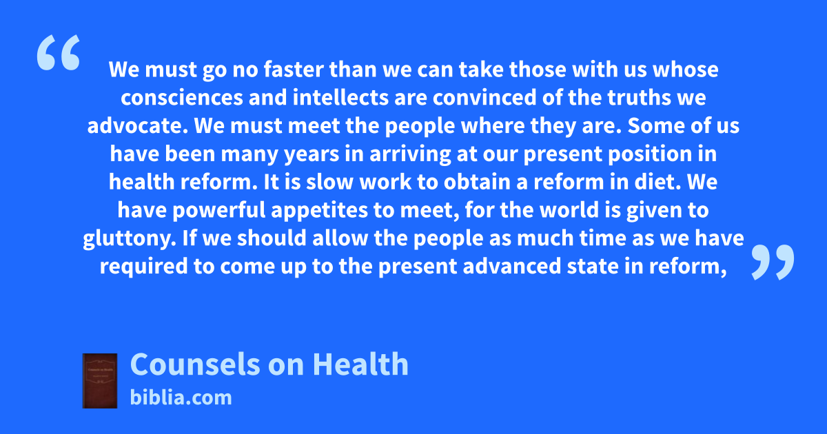 We must go no faster than we can take those with us whose consciences and intellects are convinced of the truths we advocate. We must meet the people where they are. Some of us have been many years in arriving at our present position in health reform. It is slow work to obtain a reform in diet. We have powerful appetites to meet, for the world is given to gluttony. If we should allow the people as much time as we have required to come up to the present advanced state in reform,