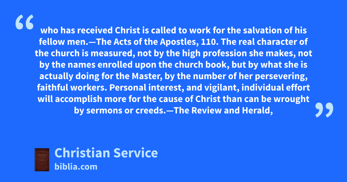 who has received Christ is called to work for the salvation of his fellow men.—The Acts of the Apostles, 110. The real character of the church is measured, not by the high profession she makes, not by the names enrolled upon the church book, but by what she is actually doing for the Master, by the number of her persevering, faithful workers. Personal interest, and vigilant, individual effort will accomplish more for the cause of Christ than can be wrought by sermons or creeds.—The Review and Herald,