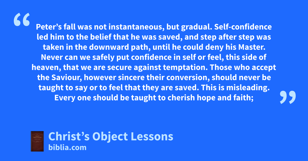Peter’s fall was not instantaneous, but gradual. Self-confidence led him to the belief that he was saved, and step after step was taken in the downward path, until he could deny his Master. Never can we safely put confidence in self or feel, this side of heaven, that we are secure against temptation. Those who accept the Saviour, however sincere their conversion, should never be taught to say or to feel that they are saved. This is misleading. Every one should be taught to cherish hope and faith;