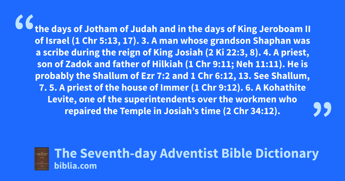 the days of Jotham of Judah and in the days of King Jeroboam II of Israel (1 Chr 5:13, 17). 3. A man whose grandson Shaphan was a scribe during the reign of King Josiah (2 Ki 22:3, 8). 4. A priest, son of Zadok and father of Hilkiah (1 Chr 9:11; Neh 11:11). He is probably the Shallum of Ezr 7:2 and 1 Chr 6:12, 13. See Shallum, 7. 5. A priest of the house of Immer (1 Chr 9:12). 6. A Kohathite Levite, one of the superintendents over the workmen who repaired the Temple in Josiah’s time (2 Chr 34:12).