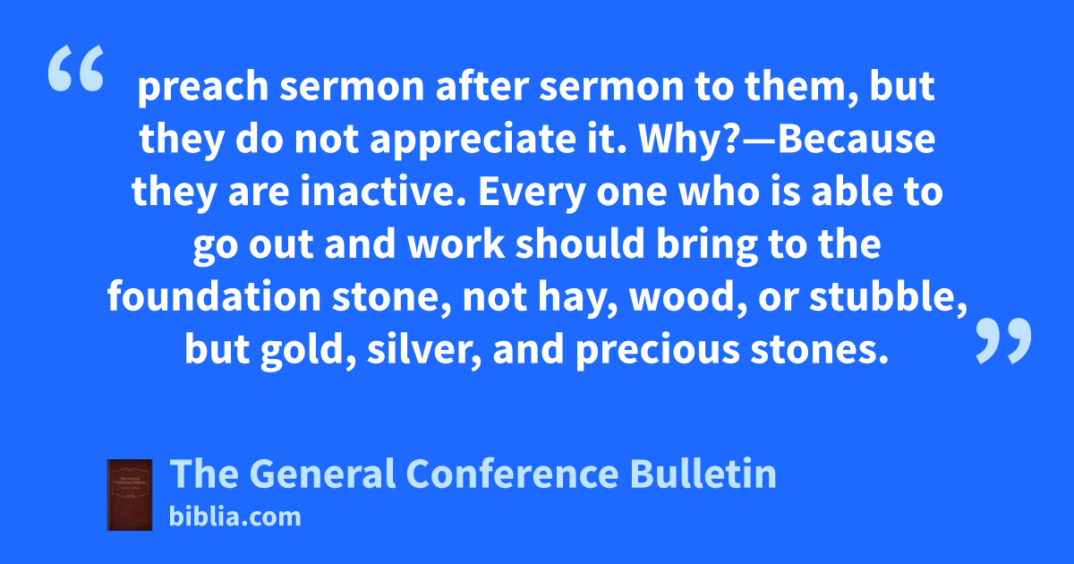 preach sermon after sermon to them, but they do not appreciate it. Why?—Because they are inactive. Every one who is able to go out and work should bring to the foundation stone, not hay, wood, or stubble, but gold, silver, and precious stones.