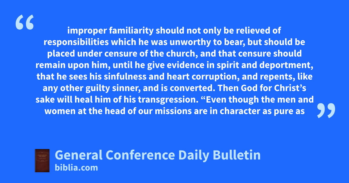 improper familiarity should not only be relieved of responsibilities which he was unworthy to bear, but should be placed under censure of the church, and that censure should remain upon him, until he give evidence in spirit and deportment, that he sees his sinfulness and heart corruption, and repents, like any other guilty sinner, and is converted. Then God for Christ’s sake will heal him of his transgression. “Even though the men and women at the head of our missions are in character as pure as