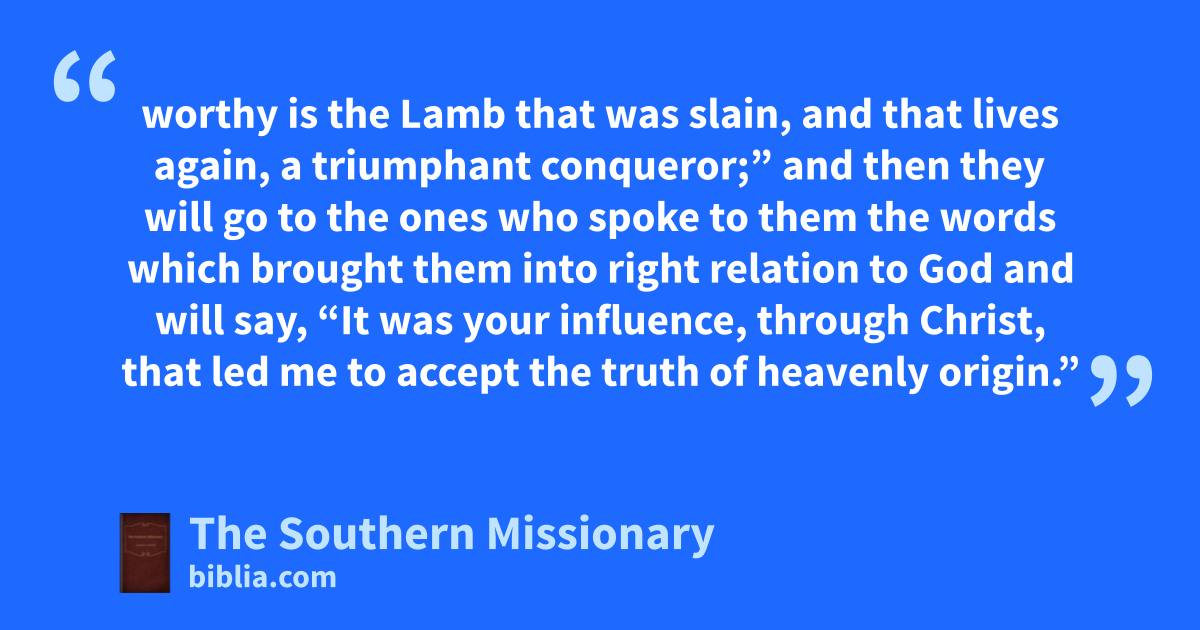 worthy is the Lamb that was slain, and that lives again, a triumphant conqueror;” and then they will go to the ones who spoke to them the words which brought them into right relation to God and will say, “It was your influence, through Christ, that led me to accept the truth of heavenly origin.”