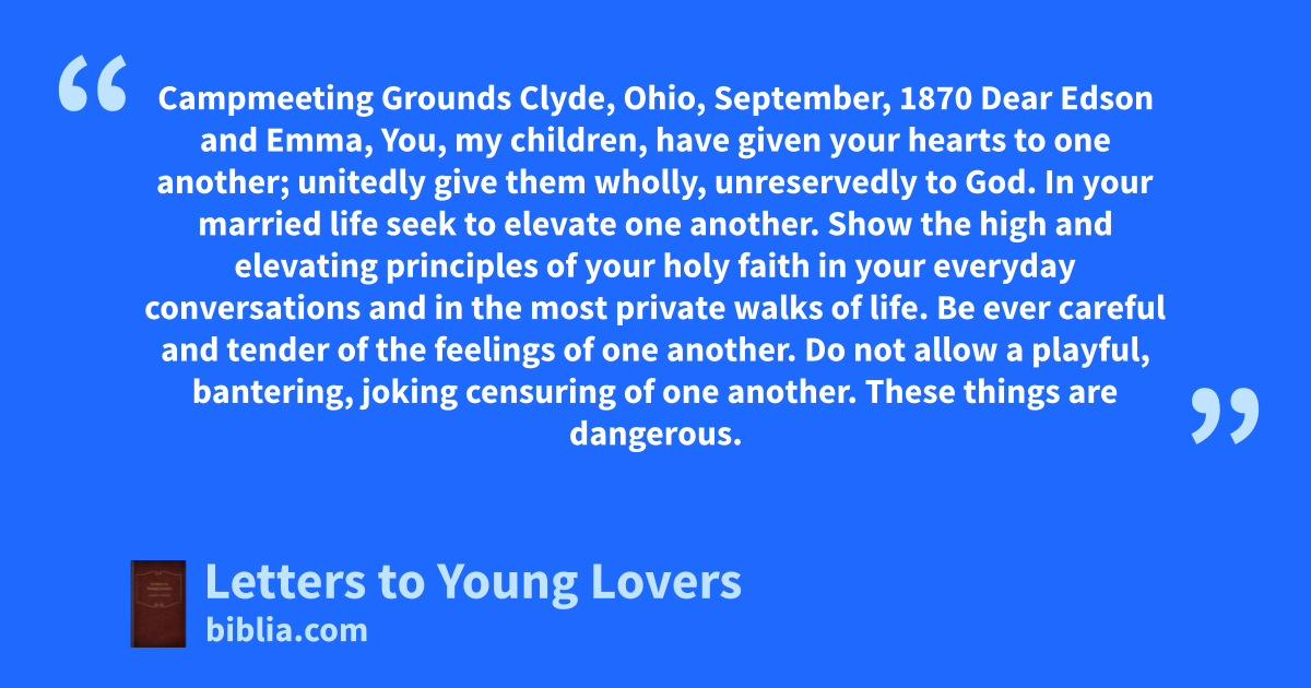 Campmeeting Grounds Clyde, Ohio, September, 1870 Dear Edson and Emma, You, my children, have given your hearts to one another; unitedly give them wholly, unreservedly to God. In your married life seek to elevate one another. Show the high and elevating principles of your holy faith in your everyday conversations and in the most private walks of life. Be ever careful and tender of the feelings of one another. Do not allow a playful, bantering, joking censuring of one another. These things are dangerous.
