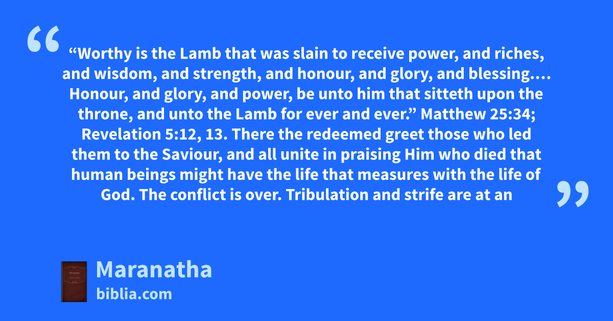 “Worthy is the Lamb that was slain to receive power, and riches, and wisdom, and strength, and honour, and glory, and blessing.… Honour, and glory, and power, be unto him that sitteth upon the throne, and unto the Lamb for ever and ever.” Matthew 25:34; Revelation 5:12, 13. There the redeemed greet those who led them to the Saviour, and all unite in praising Him who died that human beings might have the life that measures with the life of God. The conflict is over. Tribulation and strife are at an