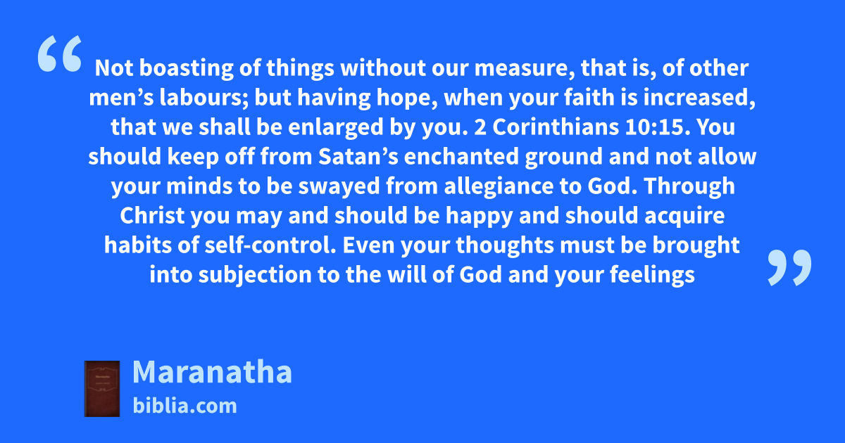 Not boasting of things without our measure, that is, of other men’s labours; but having hope, when your faith is increased, that we shall be enlarged by you. 2 Corinthians 10:15. You should keep off from Satan’s enchanted ground and not allow your minds to be swayed from allegiance to God. Through Christ you may and should be happy and should acquire habits of self-control. Even your thoughts must be brought into subjection to the will of God and your feelings