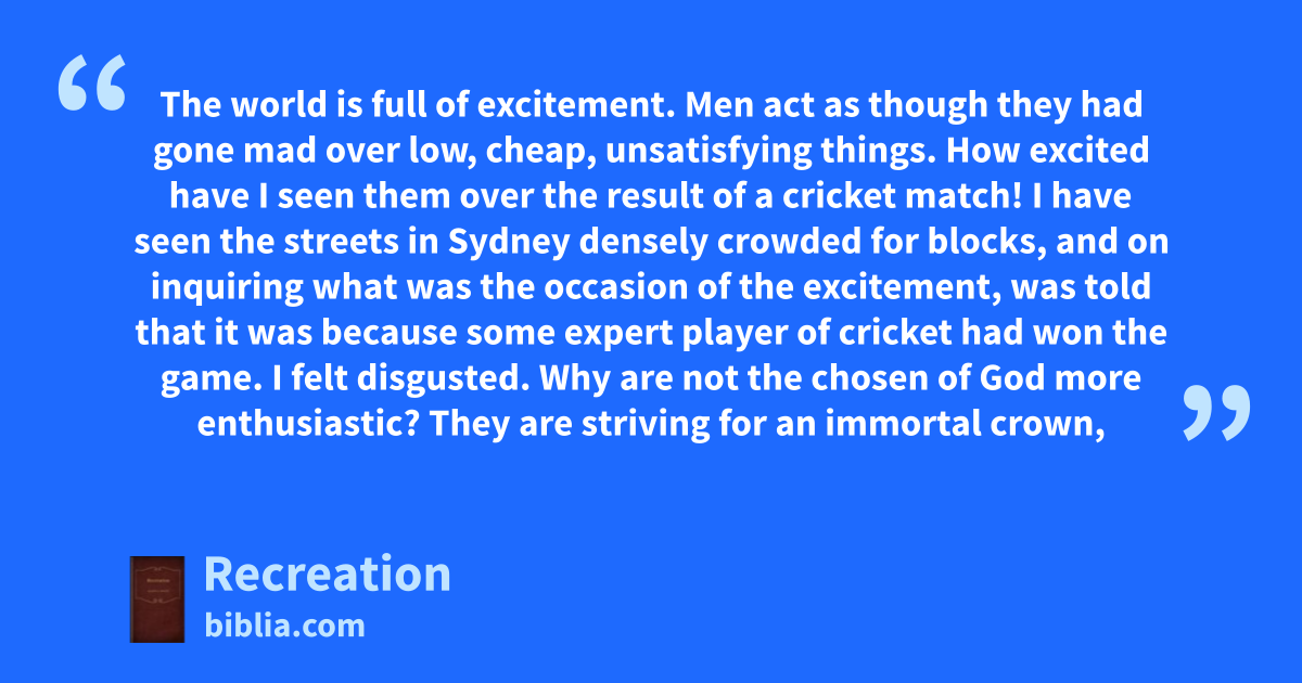 The world is full of excitement. Men act as though they had gone mad over low, cheap, unsatisfying things. How excited have I seen them over the result of a cricket match! I have seen the streets in Sydney densely crowded for blocks, and on inquiring what was the occasion of the excitement, was told that it was because some expert player of cricket had won the game. I felt disgusted. Why are not the chosen of God more enthusiastic? They are striving for an immortal crown,