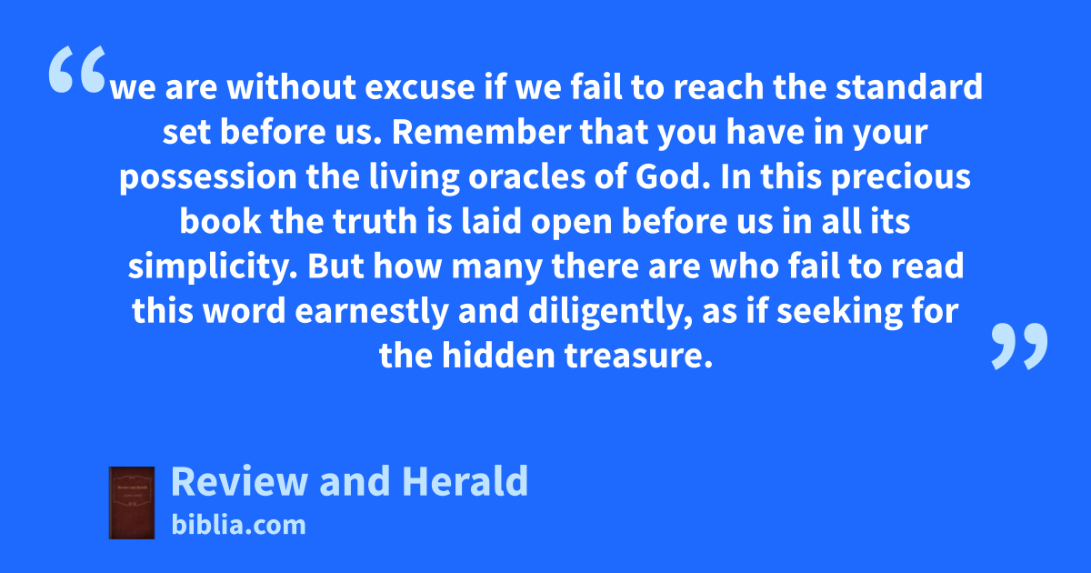 we are without excuse if we fail to reach the standard set before us. Remember that you have in your possession the living oracles of God. In this precious book the truth is laid open before us in all its simplicity. But how many there are who fail to read this word earnestly and diligently, as if seeking for the hidden treasure.