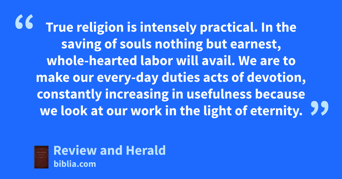 True religion is intensely practical. In the saving of souls nothing but earnest, whole-hearted labor will avail. We are to make our every-day duties acts of devotion, constantly increasing in usefulness because we look at our work in the light of eternity.
