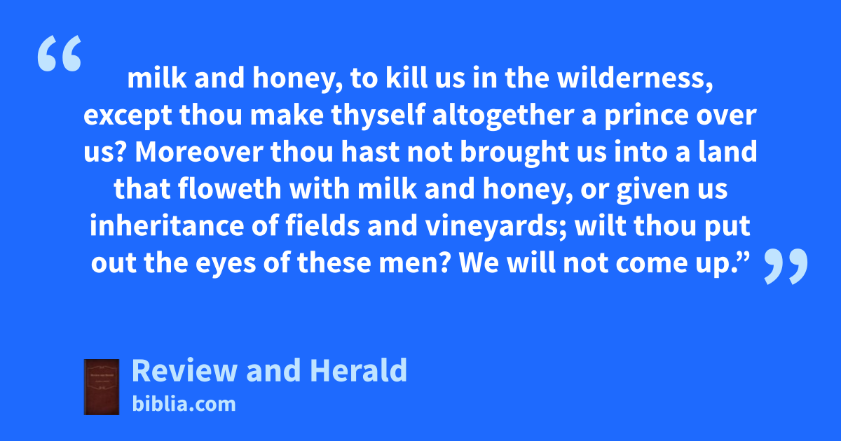 milk and honey, to kill us in the wilderness, except thou make thyself altogether a prince over us? Moreover thou hast not brought us into a land that floweth with milk and honey, or given us inheritance of fields and vineyards; wilt thou put out the eyes of these men? We will not come up.”
