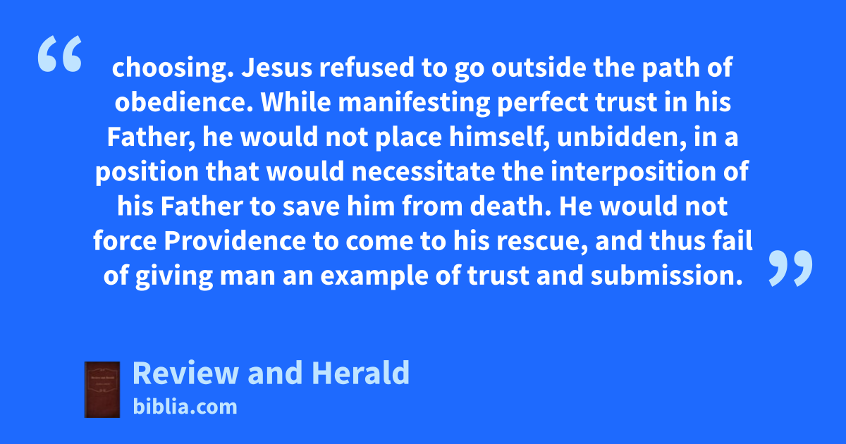 choosing. Jesus refused to go outside the path of obedience. While manifesting perfect trust in his Father, he would not place himself, unbidden, in a position that would necessitate the interposition of his Father to save him from death. He would not force Providence to come to his rescue, and thus fail of giving man an example of trust and submission.