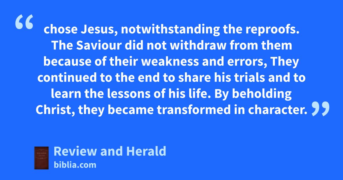 chose Jesus, notwithstanding the reproofs. The Saviour did not withdraw from them because of their weakness and errors, They continued to the end to share his trials and to learn the lessons of his life. By beholding Christ, they became transformed in character.