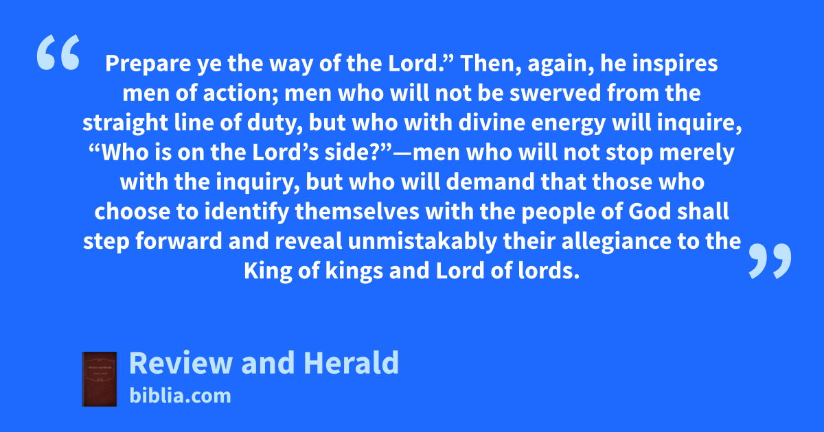 Prepare ye the way of the Lord.” Then, again, he inspires men of action; men who will not be swerved from the straight line of duty, but who with divine energy will inquire, “Who is on the Lord’s side?”—men who will not stop merely with the inquiry, but who will demand that those who choose to identify themselves with the people of God shall step forward and reveal unmistakably their allegiance to the King of kings and Lord of lords.
