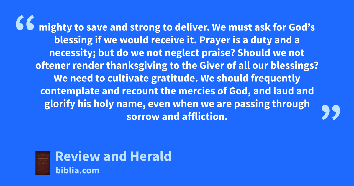 mighty to save and strong to deliver. We must ask for God’s blessing if we would receive it. Prayer is a duty and a necessity; but do we not neglect praise? Should we not oftener render thanksgiving to the Giver of all our blessings? We need to cultivate gratitude. We should frequently contemplate and recount the mercies of God, and laud and glorify his holy name, even when we are passing through sorrow and affliction.