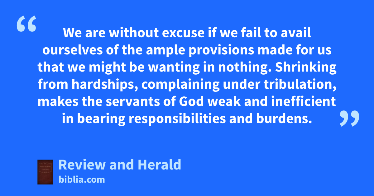 We are without excuse if we fail to avail ourselves of the ample provisions made for us that we might be wanting in nothing. Shrinking from hardships, complaining under tribulation, makes the servants of God weak and inefficient in bearing responsibilities and burdens.