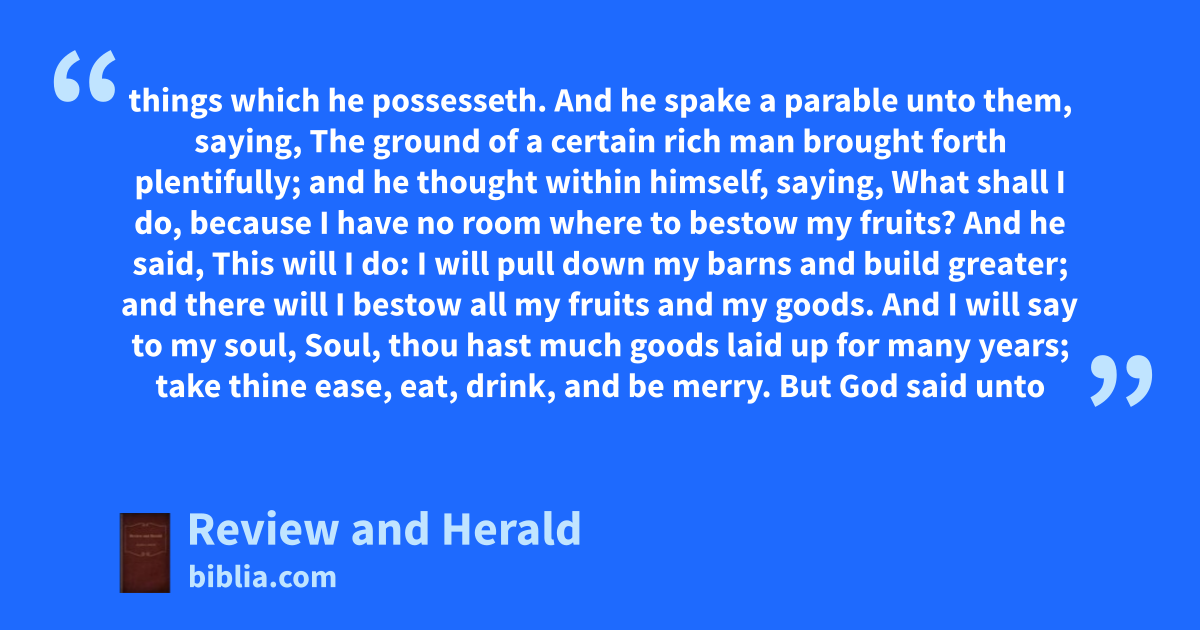 things which he possesseth. And he spake a parable unto them, saying, The ground of a certain rich man brought forth plentifully; and he thought within himself, saying, What shall I do, because I have no room where to bestow my fruits? And he said, This will I do: I will pull down my barns and build greater; and there will I bestow all my fruits and my goods. And I will say to my soul, Soul, thou hast much goods laid up for many years; take thine ease, eat, drink, and be merry. But God said unto