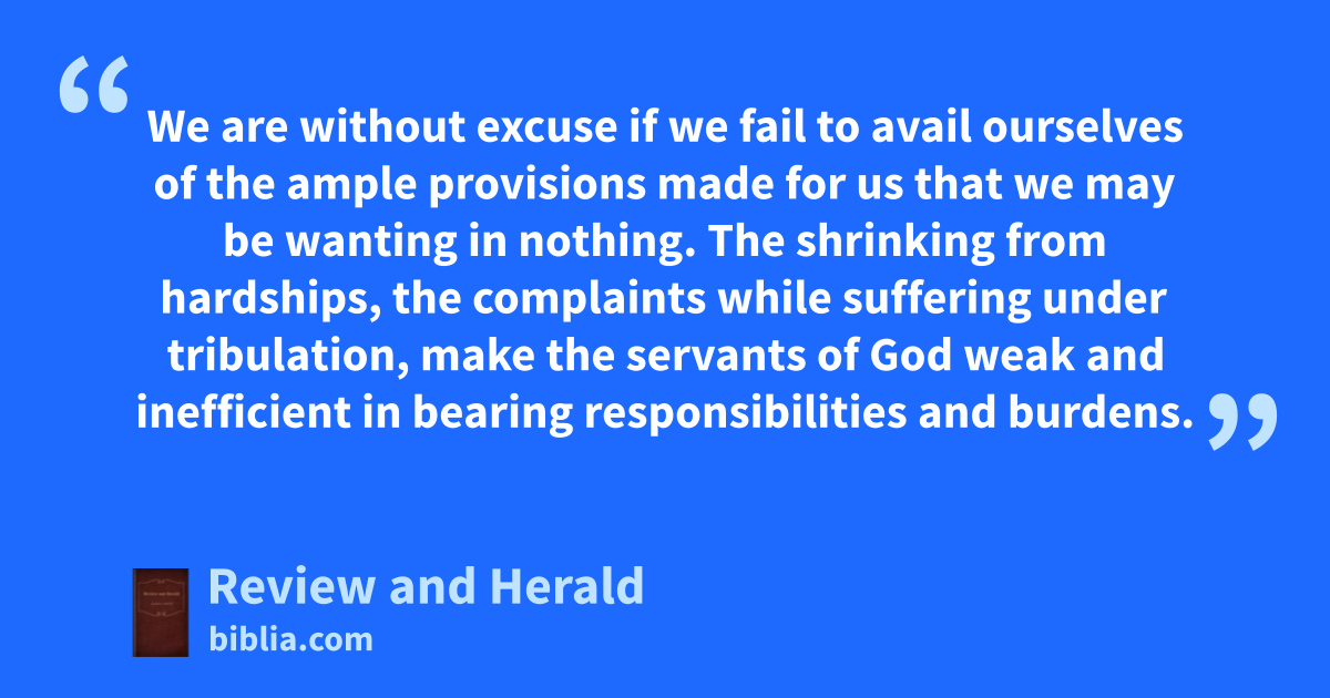 We are without excuse if we fail to avail ourselves of the ample provisions made for us that we may be wanting in nothing. The shrinking from hardships, the complaints while suffering under tribulation, make the servants of God weak and inefficient in bearing responsibilities and burdens.
