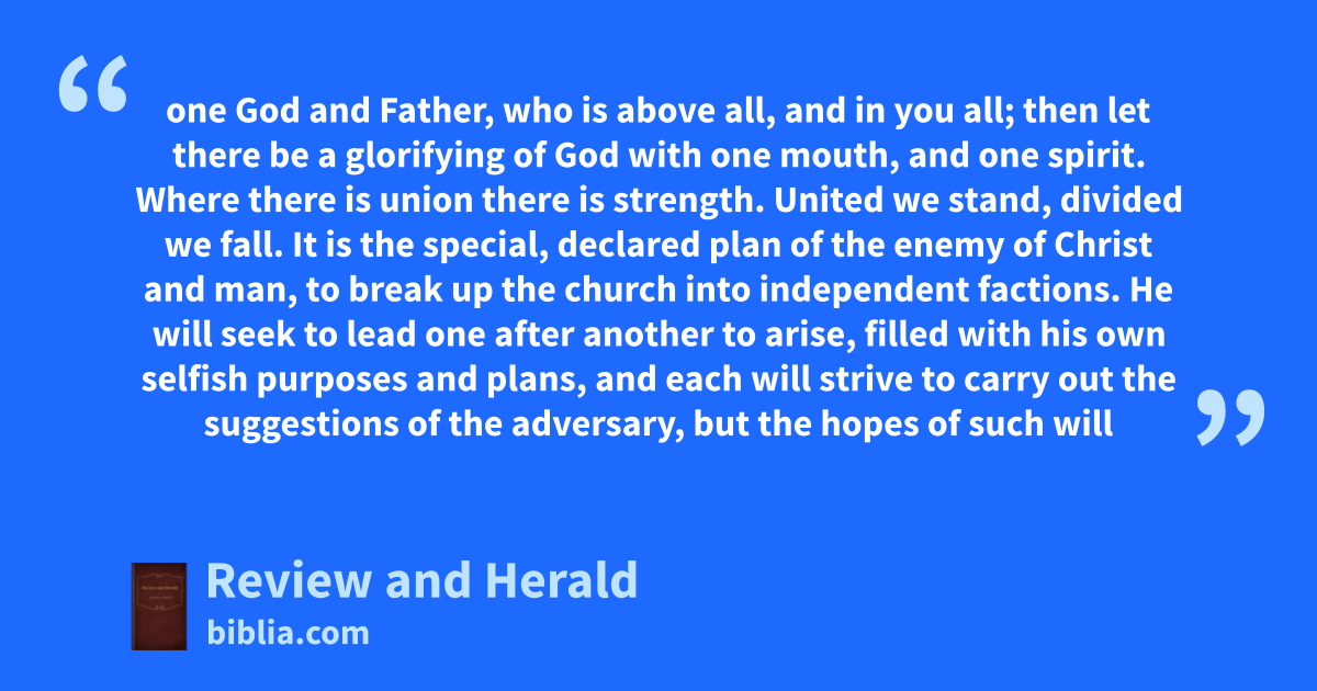 one God and Father, who is above all, and in you all; then let there be a glorifying of God with one mouth, and one spirit. Where there is union there is strength. United we stand, divided we fall. It is the special, declared plan of the enemy of Christ and man, to break up the church into independent factions. He will seek to lead one after another to arise, filled with his own selfish purposes and plans, and each will strive to carry out the suggestions of the adversary, but the hopes of such will