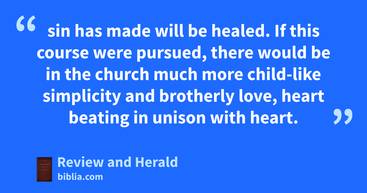 sin has made will be healed. If this course were pursued, there would be in the church much more child-like simplicity and brotherly love, heart beating in unison with heart.