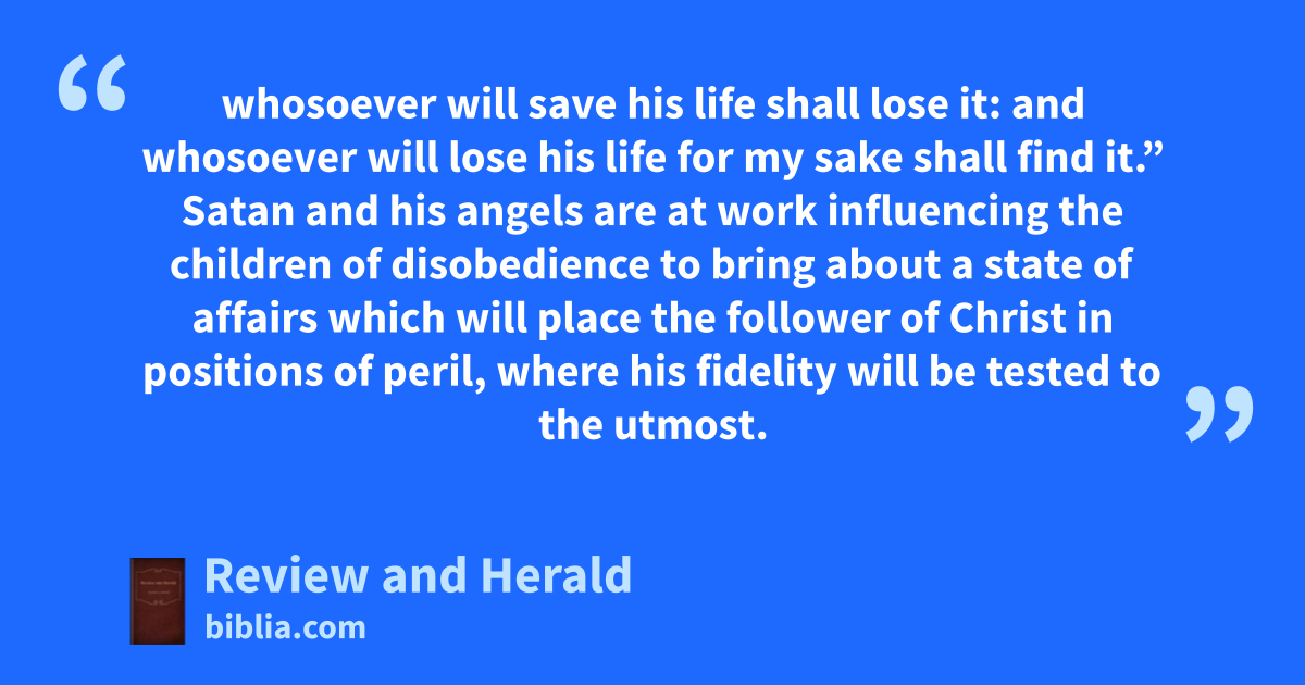 whosoever will save his life shall lose it: and whosoever will lose his life for my sake shall find it.” Satan and his angels are at work influencing the children of disobedience to bring about a state of affairs which will place the follower of Christ in positions of peril, where his fidelity will be tested to the utmost.