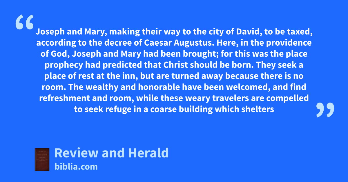 Joseph and Mary, making their way to the city of David, to be taxed, according to the decree of Caesar Augustus. Here, in the providence of God, Joseph and Mary had been brought; for this was the place prophecy had predicted that Christ should be born. They seek a place of rest at the inn, but are turned away because there is no room. The wealthy and honorable have been welcomed, and find refreshment and room, while these weary travelers are compelled to seek refuge in a coarse building which shelters