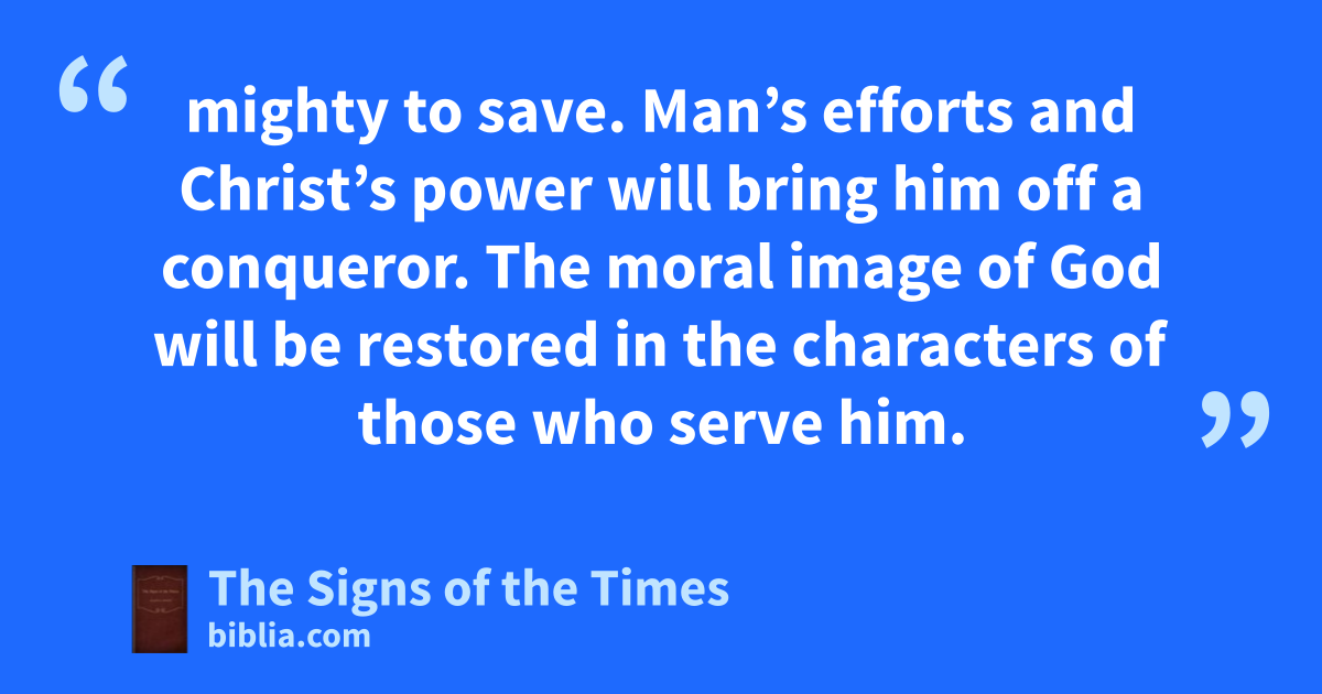 mighty to save. Man’s efforts and Christ’s power will bring him off a conqueror. The moral image of God will be restored in the characters of those who serve him.