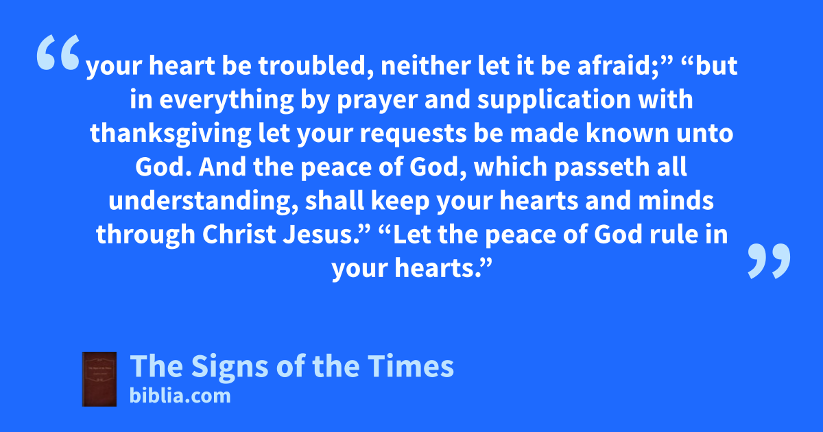 your heart be troubled, neither let it be afraid;” “but in everything by prayer and supplication with thanksgiving let your requests be made known unto God. And the peace of God, which passeth all understanding, shall keep your hearts and minds through Christ Jesus.” “Let the peace of God rule in your hearts.”