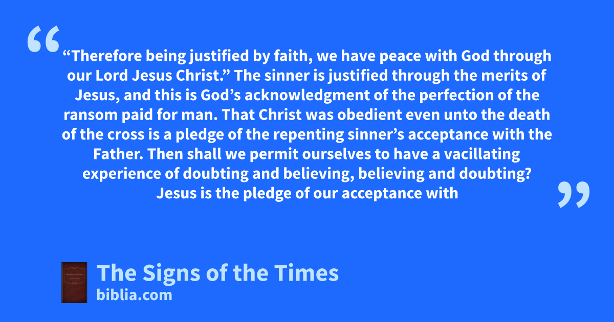 “Therefore being justified by faith, we have peace with God through our Lord Jesus Christ.” The sinner is justified through the merits of Jesus, and this is God’s acknowledgment of the perfection of the ransom paid for man. That Christ was obedient even unto the death of the cross is a pledge of the repenting sinner’s acceptance with the Father. Then shall we permit ourselves to have a vacillating experience of doubting and believing, believing and doubting? Jesus is the pledge of our acceptance with