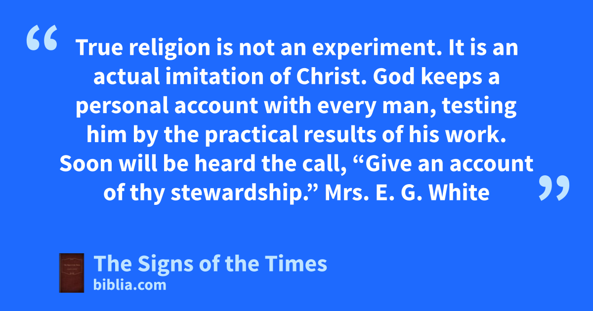 True religion is not an experiment. It is an actual imitation of Christ. God keeps a personal account with every man, testing him by the practical results of his work. Soon will be heard the call, “Give an account of thy stewardship.” Mrs. E. G. White