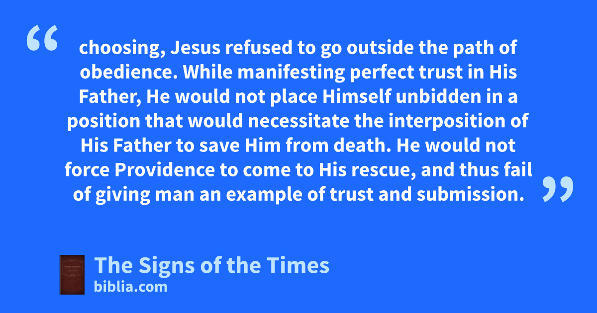 choosing, Jesus refused to go outside the path of obedience. While manifesting perfect trust in His Father, He would not place Himself unbidden in a position that would necessitate the interposition of His Father to save Him from death. He would not force Providence to come to His rescue, and thus fail of giving man an example of trust and submission.