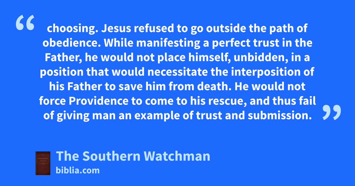 choosing. Jesus refused to go outside the path of obedience. While manifesting a perfect trust in the Father, he would not place himself, unbidden, in a position that would necessitate the interposition of his Father to save him from death. He would not force Providence to come to his rescue, and thus fail of giving man an example of trust and submission.