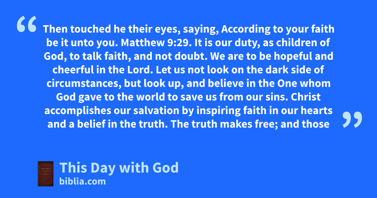 Then touched he their eyes, saying, According to your faith be it unto you. Matthew 9:29. It is our duty, as children of God, to talk faith, and not doubt. We are to be hopeful and cheerful in the Lord. Let us not look on the dark side of circumstances, but look up, and believe in the One whom God gave to the world to save us from our sins. Christ accomplishes our salvation by inspiring faith in our hearts and a belief in the truth. The truth makes free; and those