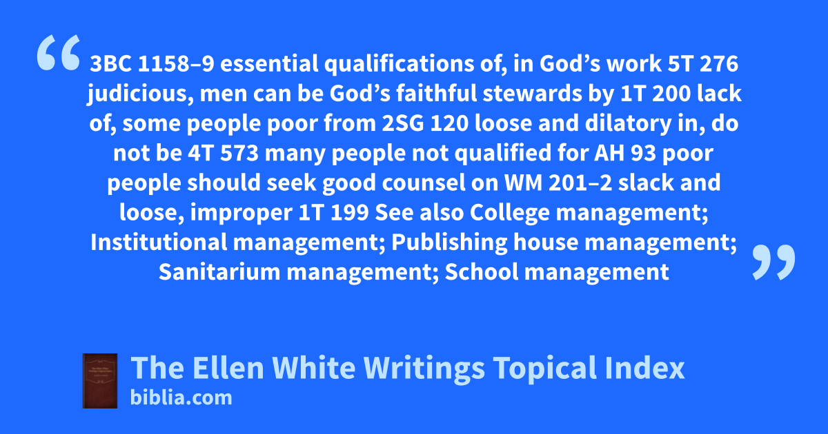 3BC 1158–9 essential qualifications of, in God’s work 5T 276 judicious, men can be God’s faithful stewards by 1T 200 lack of, some people poor from 2SG 120 loose and dilatory in, do not be 4T 573 many people not qualified for AH 93 poor people should seek good counsel on WM 201–2 slack and loose, improper 1T 199 See also College management; Institutional management; Publishing house management; Sanitarium management; School management
