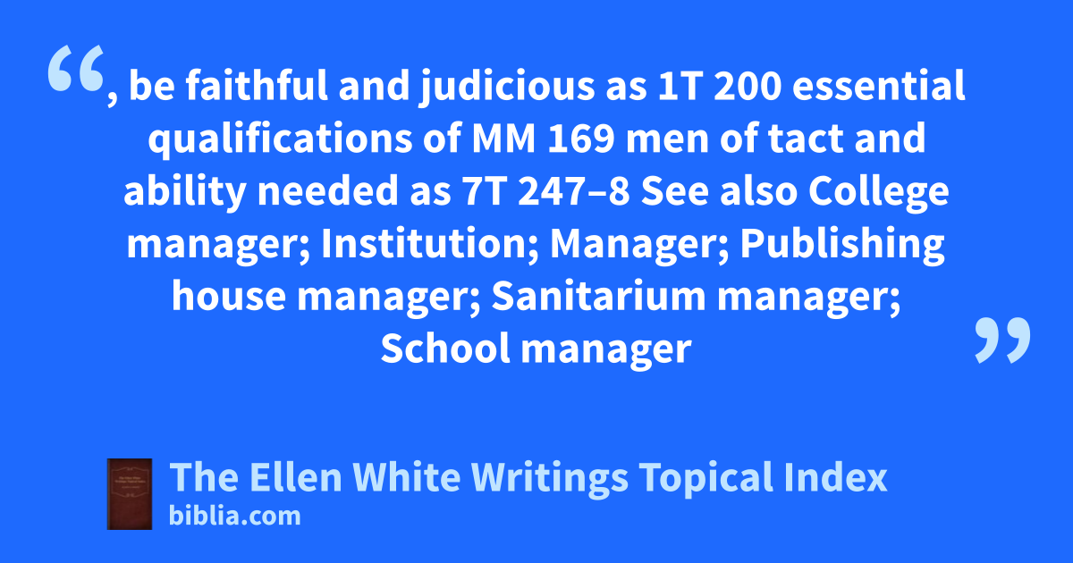 , be faithful and judicious as 1T 200 essential qualifications of MM 169 men of tact and ability needed as 7T 247–8 See also College manager; Institution; Manager; Publishing house manager; Sanitarium manager; School manager