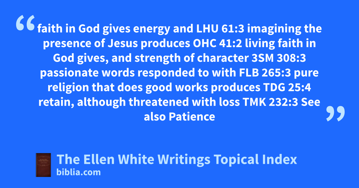 faith in God gives energy and LHU 61:3 imagining the presence of Jesus produces OHC 41:2 living faith in God gives, and strength of character 3SM 308:3 passionate words responded to with FLB 265:3 pure religion that does good works produces TDG 25:4 retain, although threatened with loss TMK 232:3 See also Patience